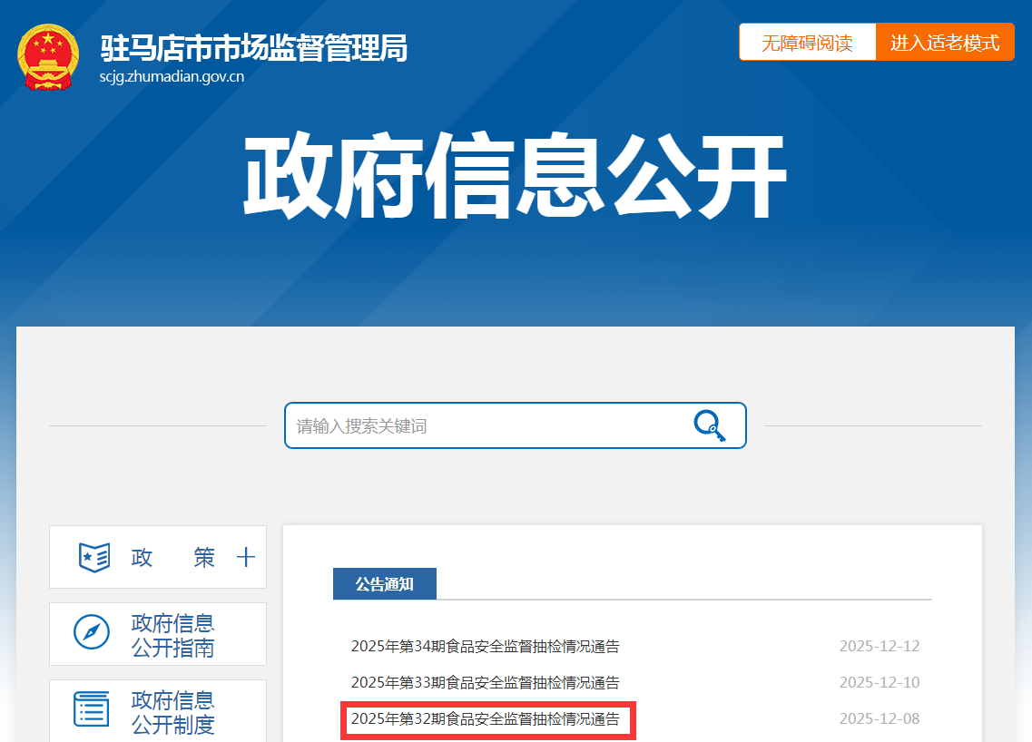 駐馬店市市場(chǎng)監(jiān)督管理局2025年第32期食品安全監(jiān)督抽檢情況通告