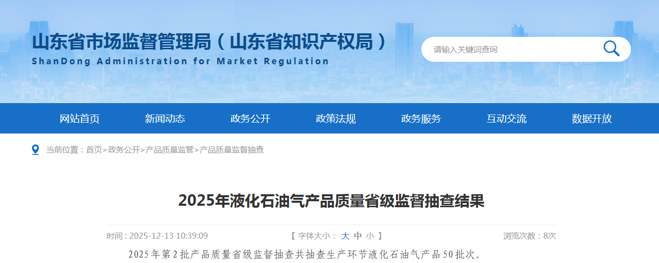 中國質(zhì)量新聞網(wǎng)訊 據(jù)山東省市場監(jiān)督管理局網(wǎng)站消息,近日,山東省市場監(jiān)督管理局公布2025年液化石油氣產(chǎn)品質(zhì)量省級監(jiān)督抽查結(jié)果。2025年第2批產(chǎn)品質(zhì)量省級監(jiān)督抽查共抽查生產(chǎn)環(huán)節(jié)液化石油氣產(chǎn)品50批次。