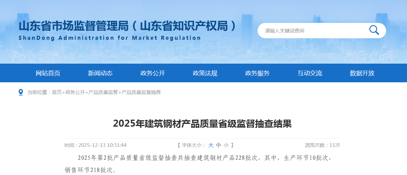 中國質(zhì)量新聞網(wǎng)訊 據(jù)山東省市場監(jiān)督管理局網(wǎng)站消息,近日,山東省市場監(jiān)督管理局公布2025年建筑鋼材產(chǎn)品質(zhì)量省級監(jiān)督抽查結(jié)果。2025年第2批產(chǎn)品質(zhì)量省級監(jiān)督抽查共抽查建筑鋼材產(chǎn)品228批次,其中,生產(chǎn)環(huán)節(jié)10批次,銷售環(huán)節(jié)218批次。