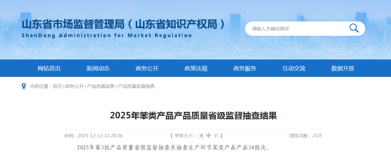 中國(guó)質(zhì)量新聞網(wǎng)訊 據(jù)山東省市場(chǎng)監(jiān)督管理局網(wǎng)站消息,近日,山東省市場(chǎng)監(jiān)督管理局公布2025年苯類產(chǎn)品產(chǎn)品質(zhì)量省級(jí)監(jiān)督抽查結(jié)果。2025年第3批產(chǎn)品質(zhì)量省級(jí)監(jiān)督抽查共抽查生產(chǎn)環(huán)節(jié)苯類產(chǎn)品產(chǎn)品34批次。