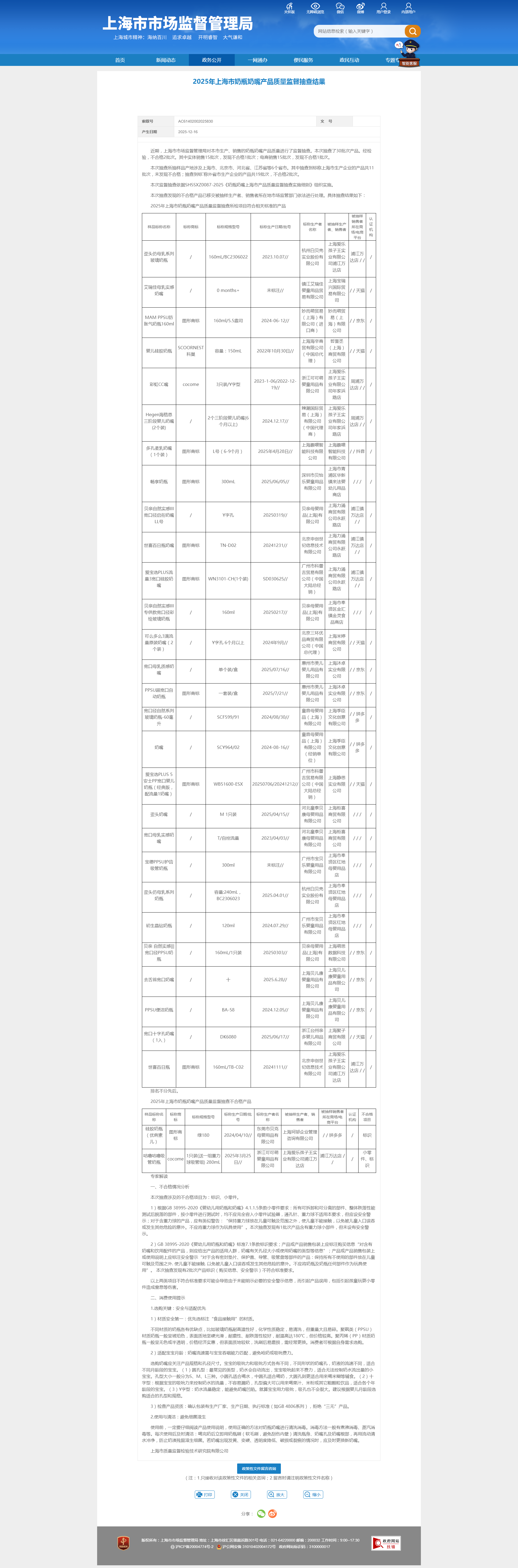 ??本次監(jiān)督抽查依據(jù)SHSSXZ0087-2025《奶瓶奶嘴上海市產(chǎn)品質(zhì)量監(jiān)督抽查實(shí)施細(xì)則》組織實(shí)施。