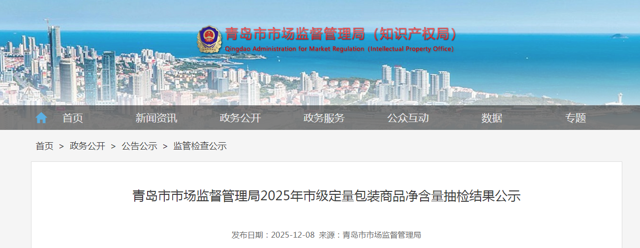 中國(guó)質(zhì)量新聞網(wǎng)訊 據(jù)山東省青島市市場(chǎng)監(jiān)督管理局網(wǎng)站消息,根據(jù)《定量包裝商品計(jì)量監(jiān)督管理辦法》《定量包裝商品凈含量計(jì)量檢驗(yàn)規(guī)則?》(JJF1070-2023)和青島市市場(chǎng)監(jiān)督管理局“雙隨機(jī) 一公開(kāi)”抽檢工作具體要求,2025年青島市市場(chǎng)監(jiān)督管理局對(duì)企業(yè)生產(chǎn)、銷售的定量包裝商品凈含量標(biāo)注和實(shí)際凈含量進(jìn)行抽樣檢驗(yàn),抽檢結(jié)果詳見(jiàn)附件。