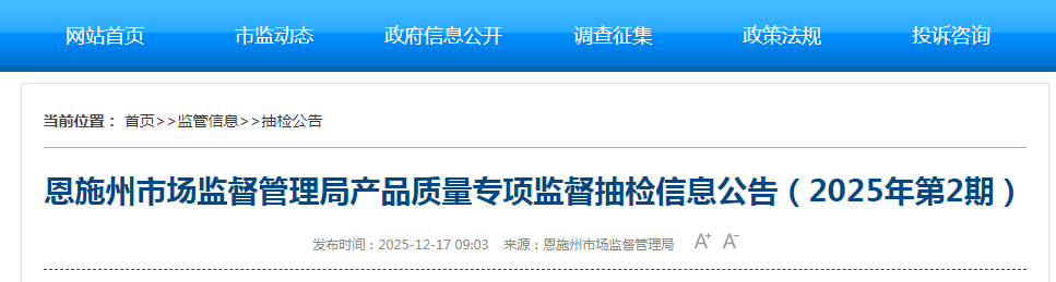 中國質(zhì)量新聞網(wǎng)訊 據(jù)湖北省恩施州市場監(jiān)督管理局網(wǎng)站消息,近日,恩施州市場監(jiān)督管理局發(fā)布產(chǎn)品質(zhì)量專項監(jiān)督抽檢信息公告(2025年第2期)。