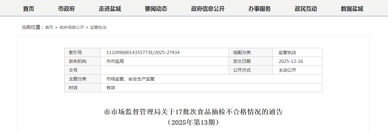 市市場(chǎng)監(jiān)督管理局關(guān)于17批次食品抽檢不合格情況的通告(2025年第13期)