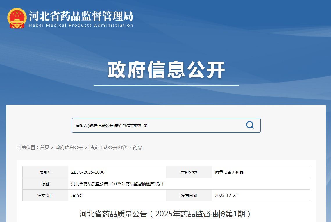 河北省藥品質(zhì)量公告(2025年藥品監(jiān)督抽檢第1期)