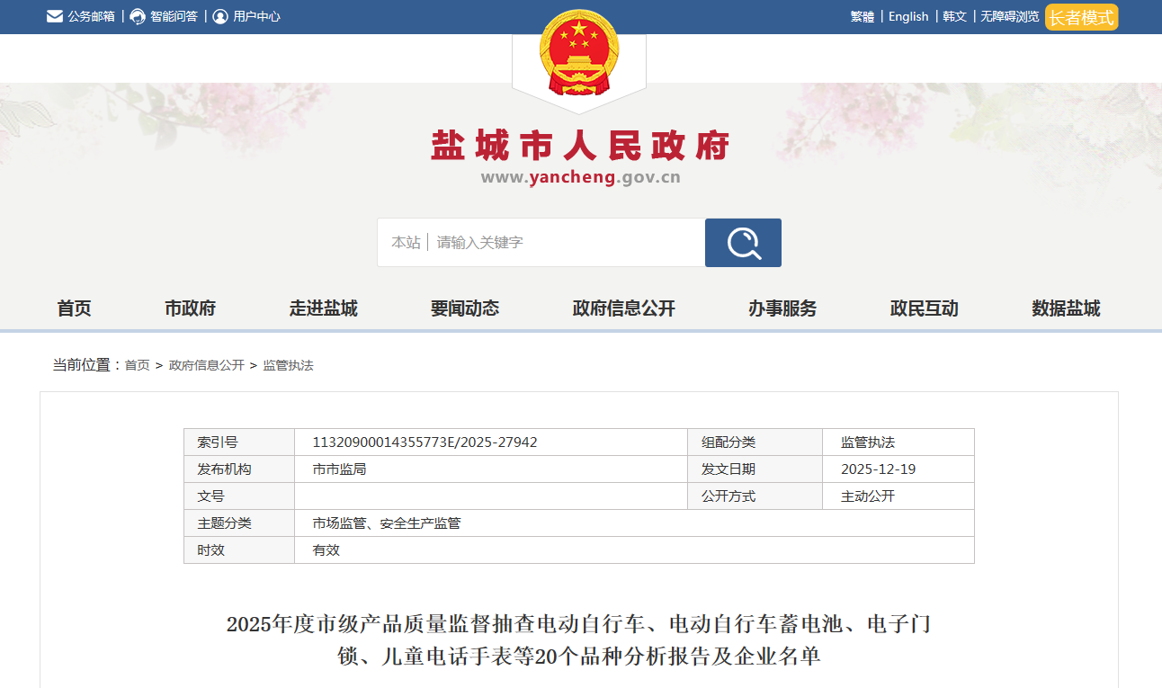 中國(guó)質(zhì)量新聞網(wǎng)訊 據(jù)江蘇省鹽城市人民政府網(wǎng)站消息,近日,鹽城市市場(chǎng)監(jiān)管局發(fā)布2025年度市級(jí)產(chǎn)品質(zhì)量監(jiān)督抽查電動(dòng)自行車、電動(dòng)自行車蓄電池、電子門鎖、兒童電話手表等20個(gè)品種分析報(bào)告及企業(yè)名單。