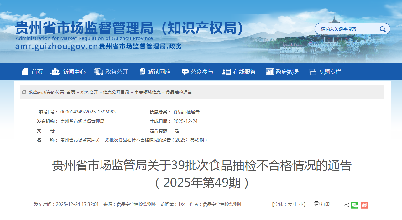 貴州省市場監(jiān)管局關于39批次食品抽檢不合格情況的通告(2025年第49期)