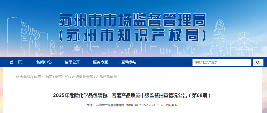 中國(guó)質(zhì)量新聞網(wǎng)訊 據(jù)蘇州市市場(chǎng)監(jiān)督管理局網(wǎng)站消息,根據(jù)相關(guān)規(guī)定,2025年,蘇州市市場(chǎng)監(jiān)督管理局委托蘇州市產(chǎn)品質(zhì)量檢驗(yàn)院有限公司對(duì)危險(xiǎn)化學(xué)品包裝物、容器產(chǎn)品質(zhì)量實(shí)施了市級(jí)監(jiān)督抽查并發(fā)布2025年危險(xiǎn)化學(xué)品包裝物、容器產(chǎn)品質(zhì)量市級(jí)監(jiān)督抽查情況公告(第68期)。