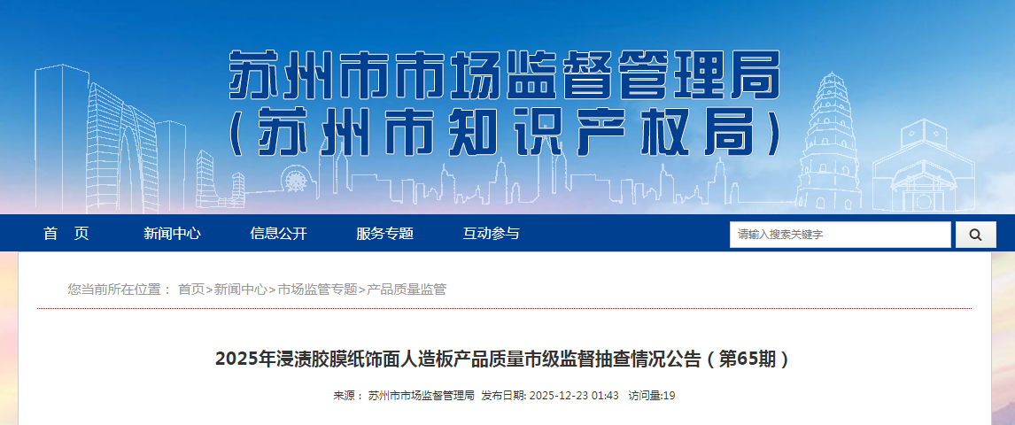 中國(guó)質(zhì)量新聞網(wǎng)訊 據(jù)蘇州市市場(chǎng)監(jiān)督管理局網(wǎng)站消息,根據(jù)相關(guān)規(guī)定,2025年度,蘇州市市場(chǎng)監(jiān)督管理局委托蘇州市產(chǎn)品質(zhì)量監(jiān)督檢驗(yàn)院對(duì)浸漬膠膜紙飾面人造板產(chǎn)品質(zhì)量實(shí)施了市級(jí)監(jiān)督抽查并發(fā)布2025年浸漬膠膜紙飾面人造板產(chǎn)品質(zhì)量市級(jí)監(jiān)督抽查情況公告(第65期)。