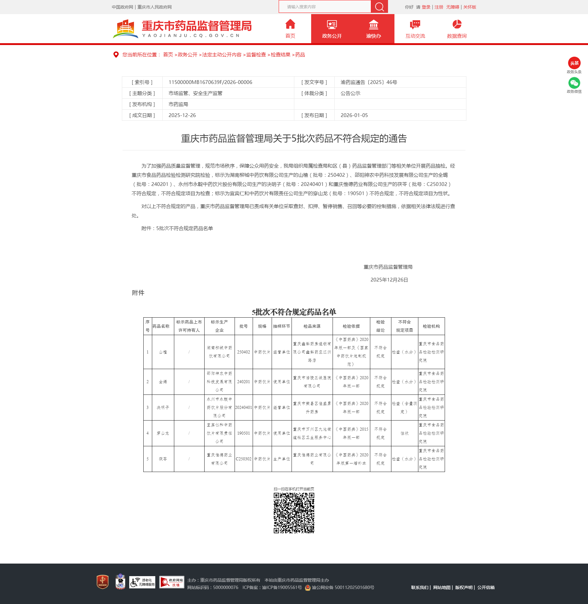 重慶市藥品監(jiān)督管理局關(guān)于5批次藥品不符合規(guī)定的通告_重慶市藥品監(jiān)督管理局.png