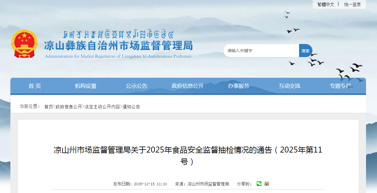 涼山州市場(chǎng)監(jiān)督管理局關(guān)于2025年食品安全監(jiān)督抽檢情況的通告(2025年第11號(hào))