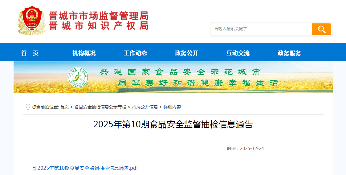 山西省晉城市市場監(jiān)督管理局2025年第10期食品安全監(jiān)督抽檢信息通告