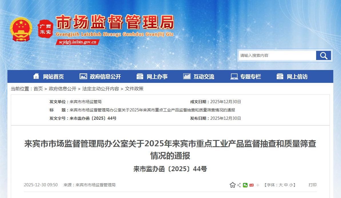 中國(guó)質(zhì)量新聞網(wǎng)訊 據(jù)廣西來(lái)賓市市場(chǎng)監(jiān)督管理局網(wǎng)站消息,近日,來(lái)賓市市場(chǎng)監(jiān)督管理局辦公室發(fā)布關(guān)于2025年來(lái)賓市重點(diǎn)工業(yè)產(chǎn)品監(jiān)督抽查和質(zhì)量篩查情況的通報(bào)。
