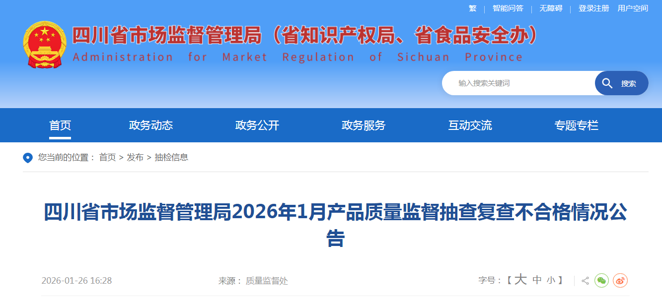 四川省市場監(jiān)督管理局2026年1月產(chǎn)品質(zhì)量監(jiān)督抽查復(fù)查不合格情況公告