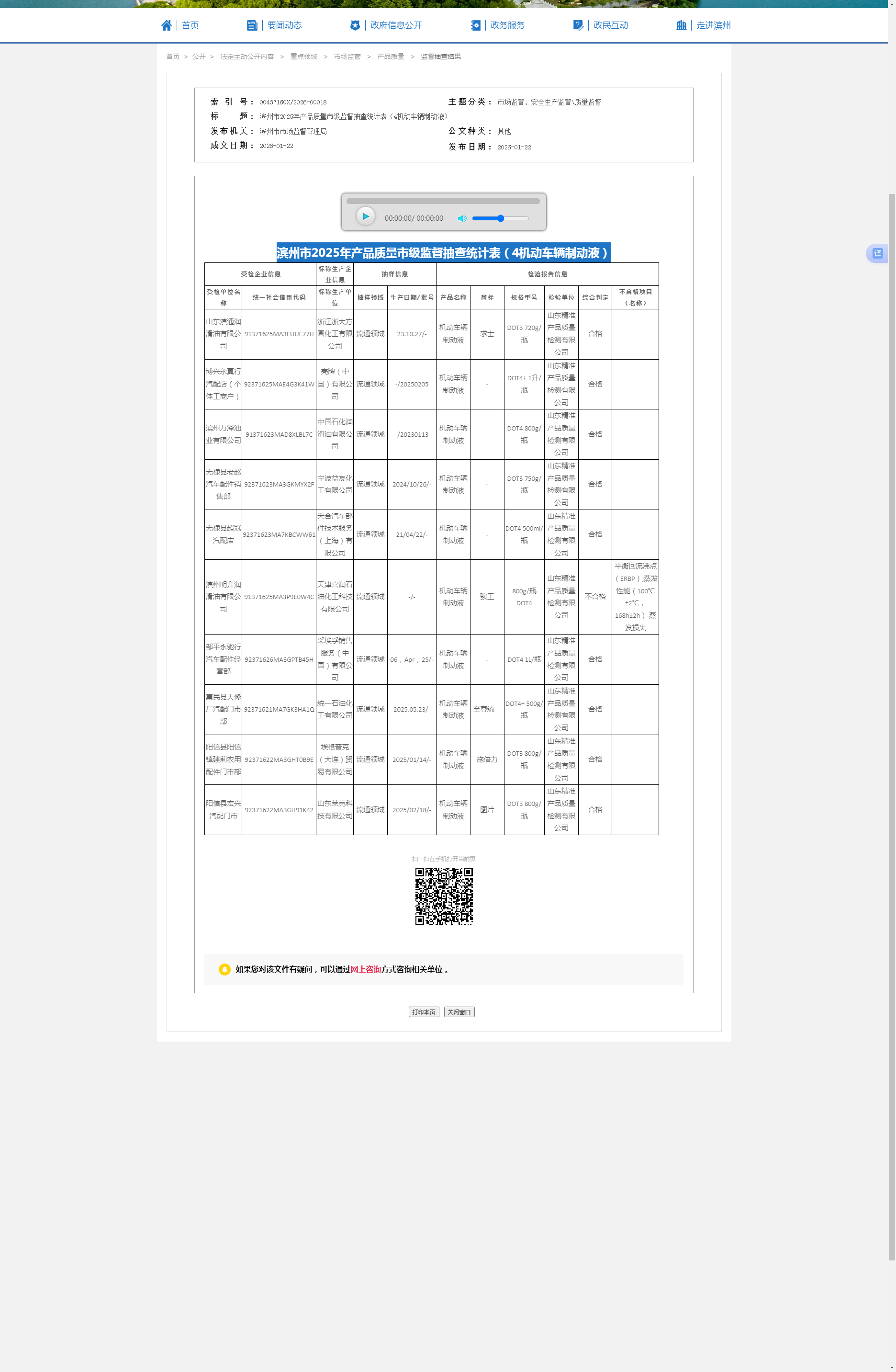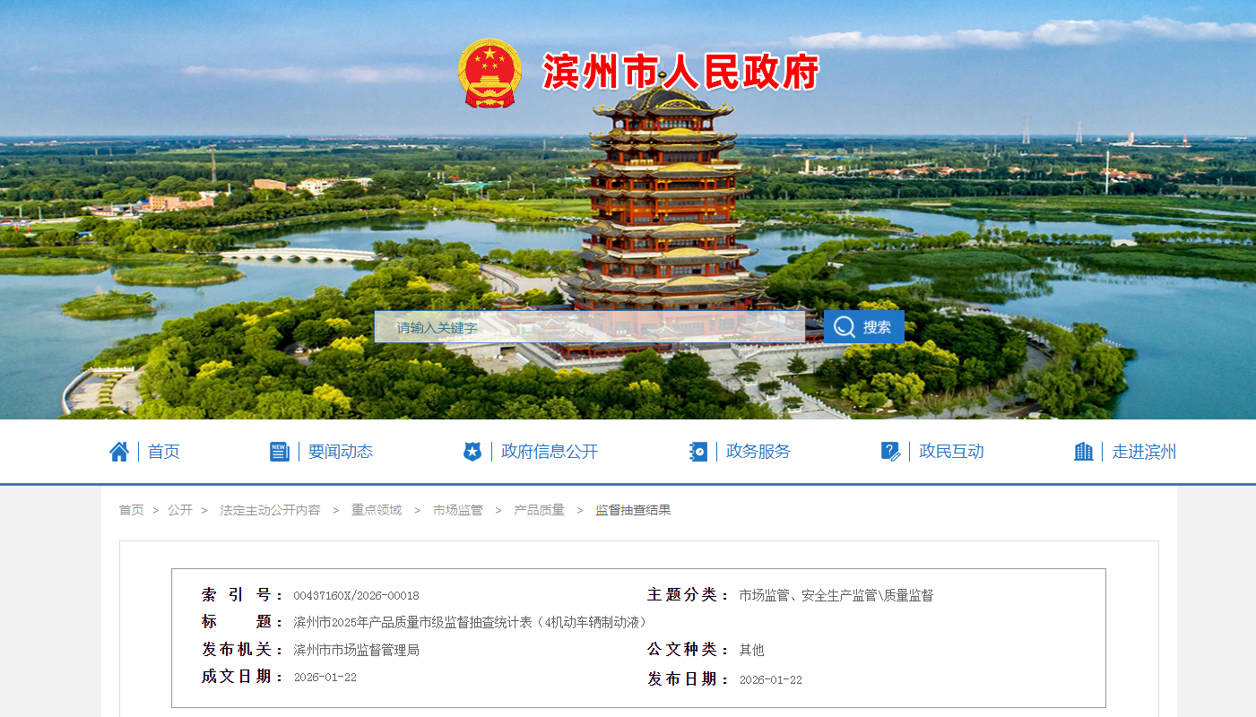 中國質(zhì)量新聞網(wǎng)訊 據(jù)山東省濱州市人民政府網(wǎng)站消息,近日,濱州市市場監(jiān)督管理局發(fā)布2025年產(chǎn)品質(zhì)量市級監(jiān)督抽查統(tǒng)計表(4機動車輛制動液)。