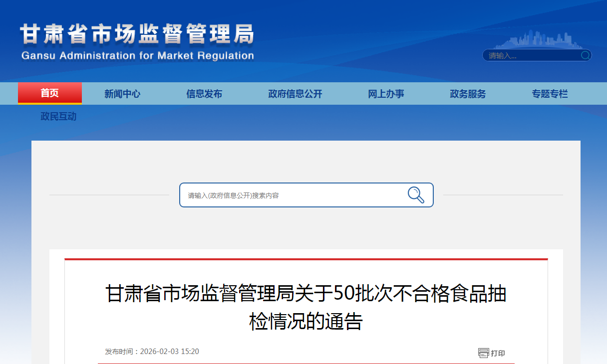 甘肅省市場(chǎng)監(jiān)督管理局關(guān)于50批次不合格食品抽檢情況的通告