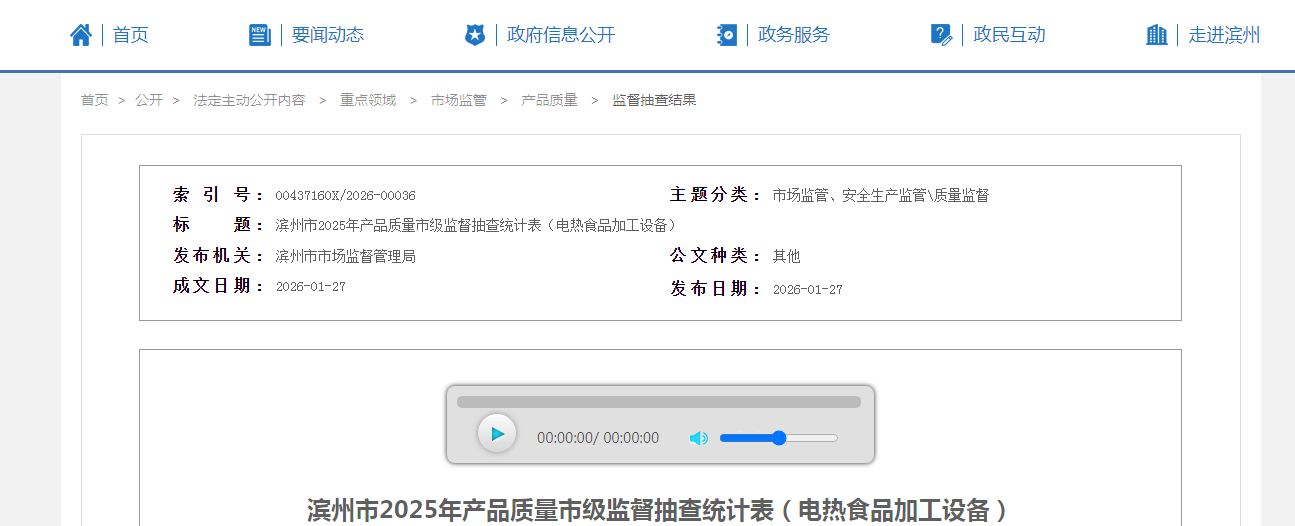中國質(zhì)量新聞網(wǎng)訊 據(jù)山東省濱州市人民政府網(wǎng)站消息,近日,濱州市市場監(jiān)督管理局發(fā)布2025年產(chǎn)品質(zhì)量市級監(jiān)督抽查統(tǒng)計表(電熱食品加工設(shè)備)。
