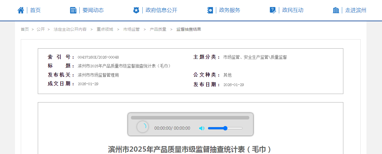中國質(zhì)量新聞網(wǎng)訊 據(jù)山東省濱州市人民政府網(wǎng)站消息,近日,濱州市市場監(jiān)督管理局發(fā)布2025年產(chǎn)品質(zhì)量市級監(jiān)督抽查統(tǒng)計表(毛巾)。