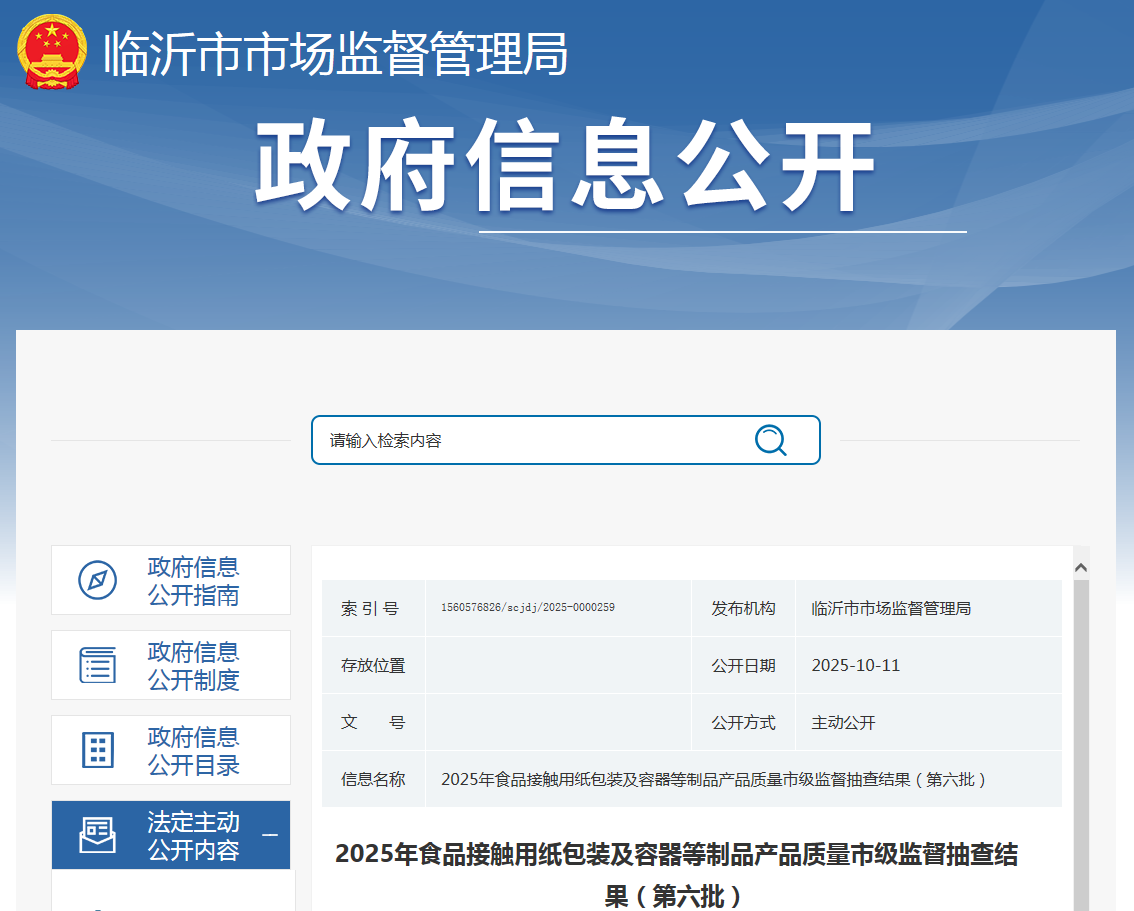 中國質(zhì)量新聞網(wǎng)訊 據(jù)山東省臨沂市市場監(jiān)督管理局網(wǎng)站消息,近日,臨沂市市場監(jiān)督管理局公布2025年食品接觸用紙包裝及容器等制品產(chǎn)品質(zhì)量市級監(jiān)督抽查結(jié)果(第六批)。本次共抽查銷售環(huán)節(jié)食品接觸用紙包裝及容器等制品產(chǎn)品5批次。