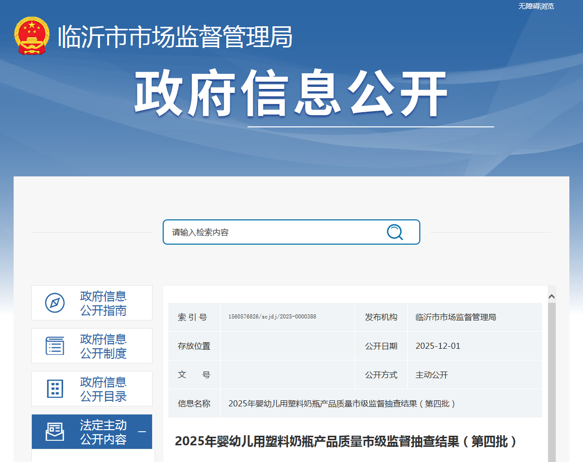 中國質(zhì)量新聞網(wǎng)訊 據(jù)山東省臨沂市市場監(jiān)督管理局網(wǎng)站消息,近日,臨沂市市場監(jiān)督管理局公布2025年嬰幼兒用塑料奶瓶產(chǎn)品質(zhì)量市級(jí)監(jiān)督抽查結(jié)果(第四批)。本次共抽查嬰幼兒用塑料奶瓶產(chǎn)品5批次,其中,銷售環(huán)節(jié)3批次,網(wǎng)售環(huán)節(jié)2批次。