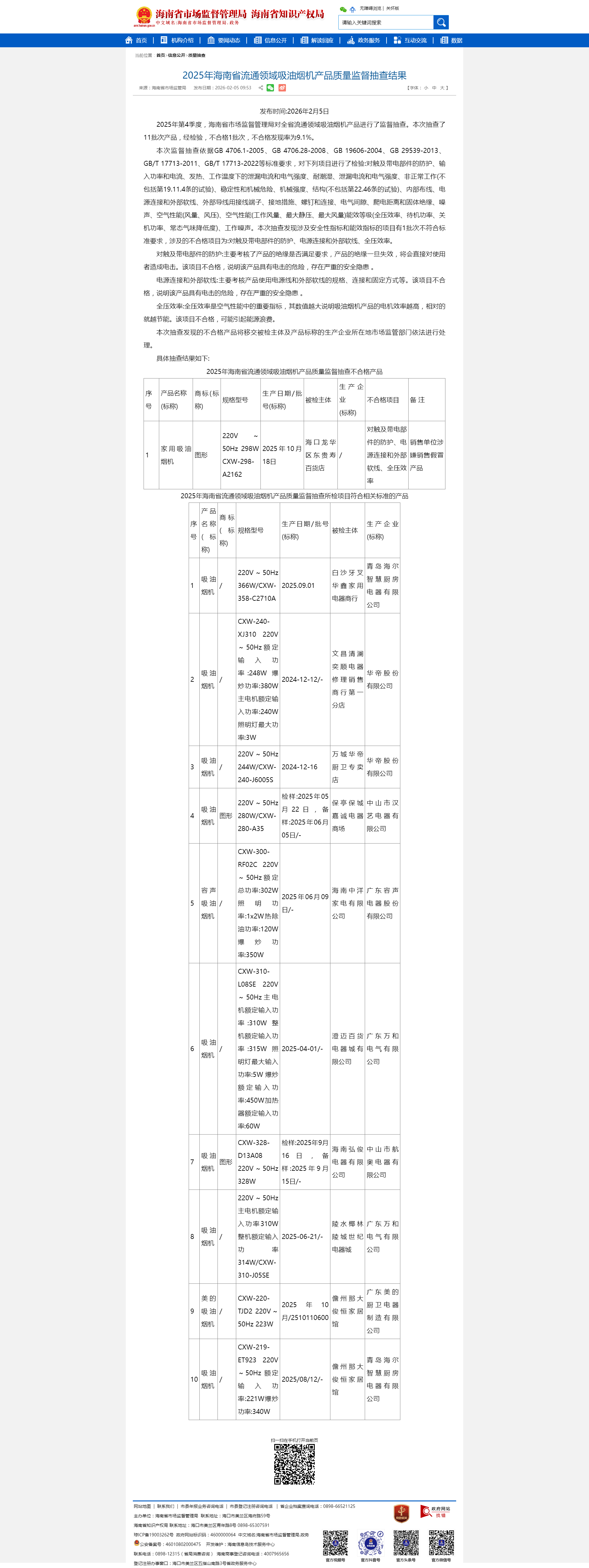 2025年海南省流通領(lǐng)域吸油煙機(jī)產(chǎn)品質(zhì)量監(jiān)督抽查結(jié)果