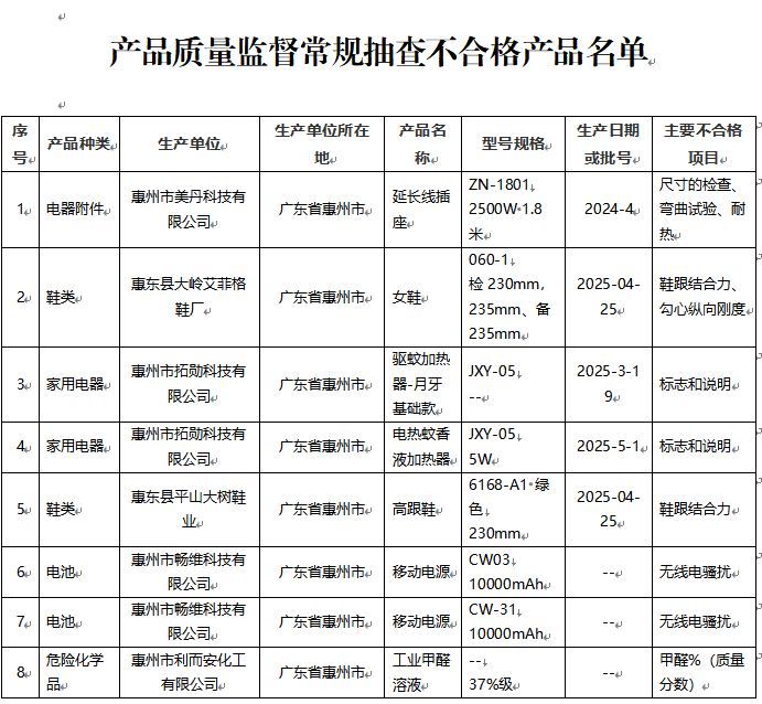 惠州市市場(chǎng)監(jiān)督管理局2025年對(duì)惠州市生產(chǎn)和流通領(lǐng)域的家用電器、紡織品、塑料購(gòu)物袋、建筑材料、燃?xì)饩?、消防器具、電線電纜、電器附件、燈具、鞋類、電源適配器、電池、箱包、文體用品、肥料、電動(dòng)自行車、水泥、涂料、家具、文具、電子產(chǎn)品、危險(xiǎn)化學(xué)品等22類產(chǎn)品共131批次開展質(zhì)量監(jiān)督抽查(常規(guī)抽查)。本次抽查不合格產(chǎn)品涉及電器附件1批次、鞋類2批次、家用電器2批次、電池2批次、危險(xiǎn)化學(xué)品1批次。