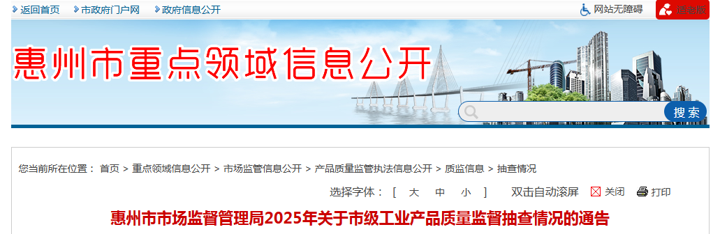 中國(guó)質(zhì)量新聞網(wǎng)訊 據(jù)廣東省惠州市人民政府網(wǎng)站消息,根據(jù)《中華人民共和國(guó)產(chǎn)品質(zhì)量法》《廣東省產(chǎn)品質(zhì)量監(jiān)督條例》及《產(chǎn)品質(zhì)量監(jiān)督抽查管理暫行辦法》等相關(guān)規(guī)定,2025年惠州市市場(chǎng)監(jiān)督管理局組織開展市級(jí)工業(yè)產(chǎn)品質(zhì)量監(jiān)督抽查,現(xiàn)將有關(guān)情況通告如下: