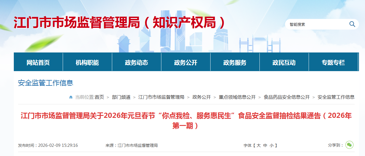 江門市市場監(jiān)督管理局關(guān)于2026年元旦春節(jié)“你點我檢、服務(wù)惠民生”食品安全監(jiān)督抽檢結(jié)果通告(2026年第一期)