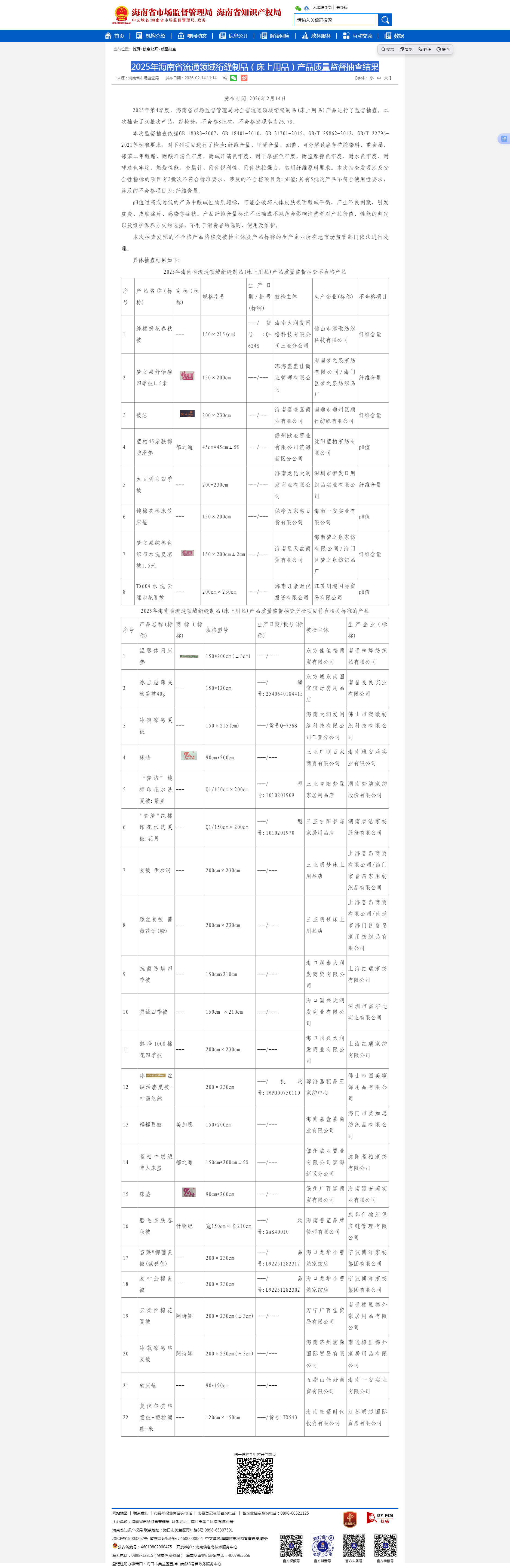 2025年海南省流通領(lǐng)域絎縫制品(床上用品)產(chǎn)品質(zhì)量監(jiān)督抽查不合格產(chǎn)品