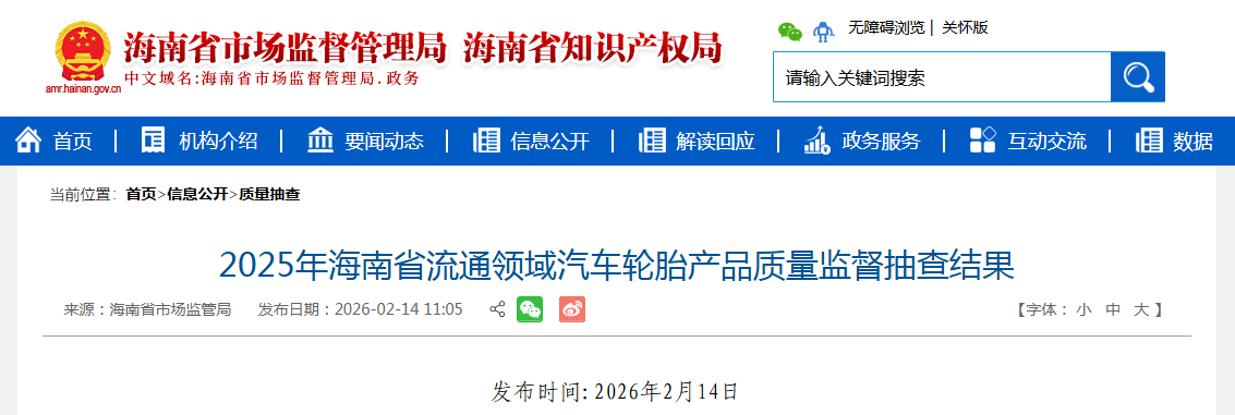 中國(guó)質(zhì)量新聞網(wǎng)訊 據(jù)海南省市場(chǎng)監(jiān)督管理局網(wǎng)站消息,2025年第4季度,海南省市場(chǎng)監(jiān)督管理局對(duì)全省流通領(lǐng)域汽車輪胎產(chǎn)品進(jìn)行了監(jiān)督抽查。本次抽查了15批次產(chǎn)品,經(jīng)檢驗(yàn),全部合格。