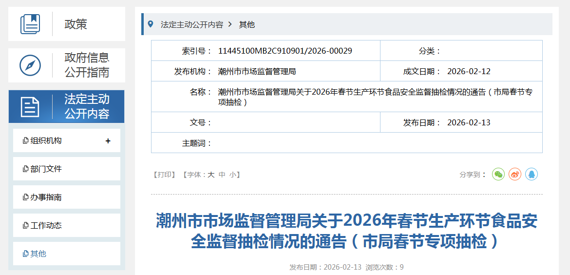 潮州市市場監(jiān)督管理局關(guān)于2026年春節(jié)生產(chǎn)環(huán)節(jié)食品安全監(jiān)督抽檢情況的通告(市局春節(jié)專項抽檢)