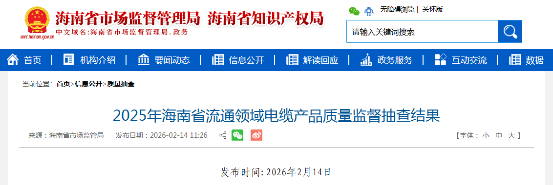 中國(guó)質(zhì)量新聞網(wǎng)訊 據(jù)海南省市場(chǎng)監(jiān)督管理局網(wǎng)站消息,2025年第4季度,海南省市場(chǎng)監(jiān)督管理局對(duì)全省流通領(lǐng)域電纜產(chǎn)品進(jìn)行了監(jiān)督抽查。本次抽查了13批次產(chǎn)品,經(jīng)檢驗(yàn),不合格1批次。