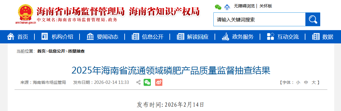 中國(guó)質(zhì)量新聞網(wǎng)訊 據(jù)海南省市場(chǎng)監(jiān)督管理局網(wǎng)站消息,2025年第4季度,海南省市場(chǎng)監(jiān)督管理局對(duì)全省流通領(lǐng)域磷肥產(chǎn)品進(jìn)行了監(jiān)督抽查。本次抽查了13批次產(chǎn)品,經(jīng)檢驗(yàn),不合格1批次。