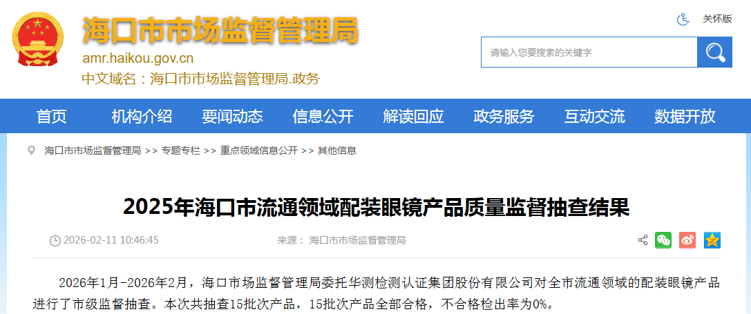 中國(guó)質(zhì)量新聞網(wǎng)訊 據(jù)??谑惺袌?chǎng)監(jiān)督管理局網(wǎng)站消息,2026年1月-2026年2月,??谑惺袌?chǎng)監(jiān)督管理局委托華測(cè)檢測(cè)認(rèn)證集團(tuán)股份有限公司對(duì)全市流通領(lǐng)域的配裝眼鏡產(chǎn)品進(jìn)行了市級(jí)監(jiān)督抽查。本次共抽查15批次產(chǎn)品,15批次產(chǎn)品全部合格,不合格檢出率為0%。