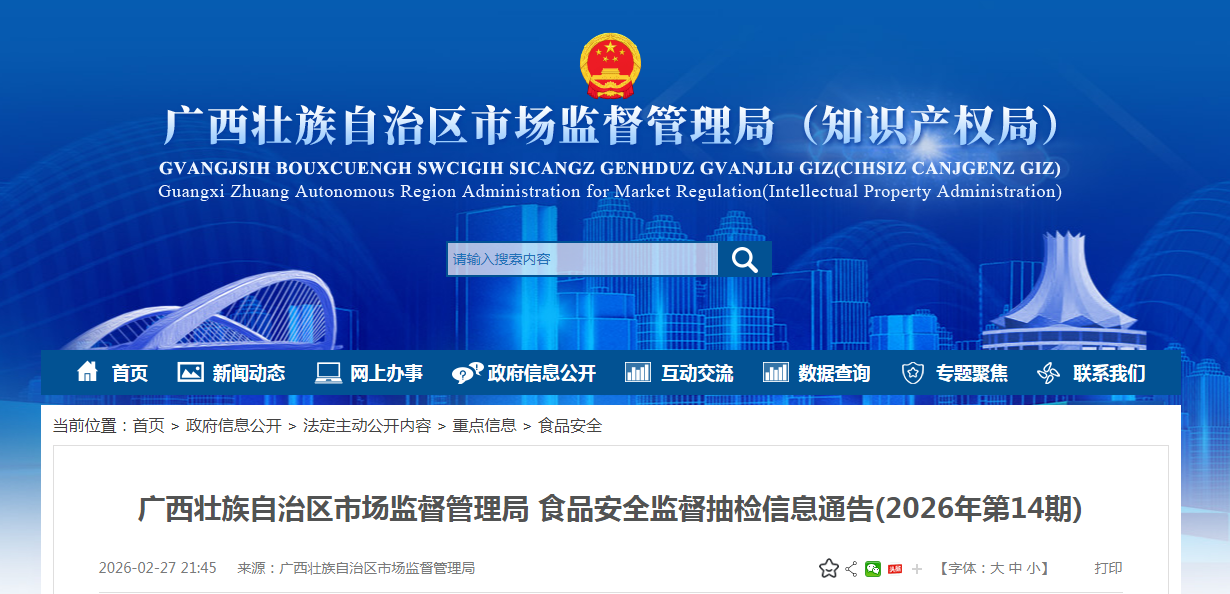 廣西壯族自治區(qū)市場監(jiān)督管理局食品安全監(jiān)督抽檢信息通告(2026年第14期)