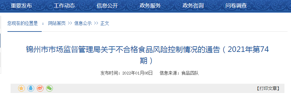 中國質(zhì)量新聞網(wǎng)訊 2022年1月6日,遼寧省錦州市市場監(jiān)督管理局網(wǎng)站發(fā)布關(guān)于不合格食品風險控制情況的通告(2021年第74期)。