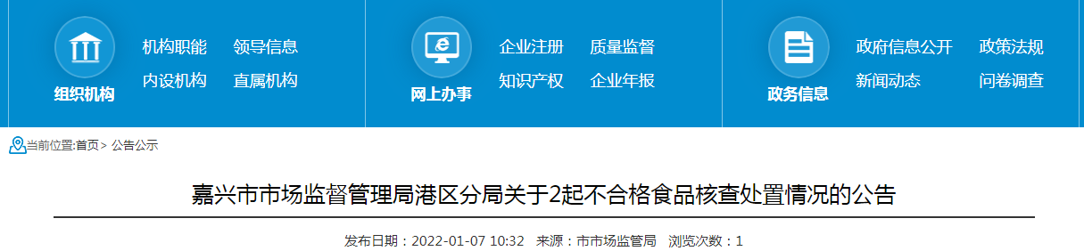 嘉興市市場監(jiān)督管理局港區(qū)分局關(guān)于2起不合格食品核查處置情況的公告