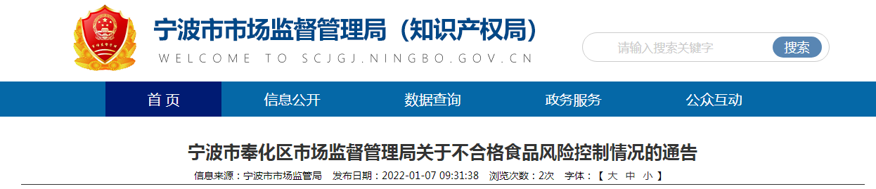 中國質(zhì)量新聞網(wǎng)訊 2022年1月7日,浙江省寧波市奉化區(qū)市場監(jiān)督管理局發(fā)布關(guān)于不合格食品風險控制情況的通告。