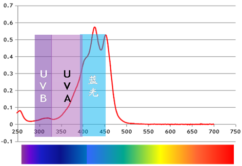 一是,西紅花酸具有抗藍光效果,尤其是對短波藍光吸收更為強烈,在425nm處消光系數(shù)Logε達到5.1,是蝦青素的2倍,茶多酚的20倍。