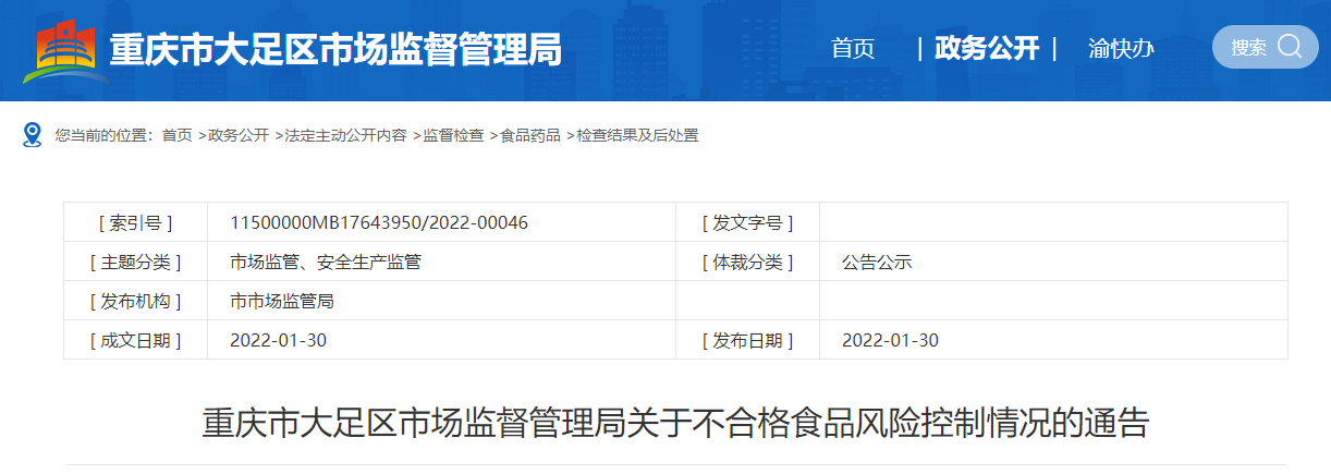 重慶市大足區(qū)市場監(jiān)督管理局關(guān)于不合格食品風(fēng)險控制情況的通告