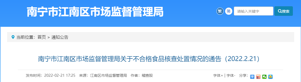 中國(guó)質(zhì)量新聞網(wǎng)訊 近日,南寧市江南區(qū)市場(chǎng)監(jiān)督管理局發(fā)布關(guān)于不合格食品核查處置情況的通告(2022.2.21)。近期,廣西壯族自治區(qū)市場(chǎng)監(jiān)督管理局發(fā)布的不合格食品情況的通告,涉及轄區(qū)6家企業(yè),其中一家企業(yè)不合格食品核查處置情況如下: