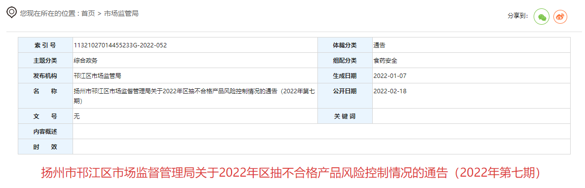 揚(yáng)州市邗江區(qū)市場監(jiān)督管理局關(guān)于2022年區(qū)抽不合格產(chǎn)品風(fēng)險(xiǎn)控制情況的通告(2022年第七期)