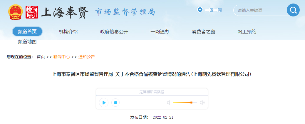 中國質(zhì)量新聞網(wǎng)訊 近日,上海市奉賢區(qū)市場監(jiān)督管理局發(fā)布關于不合格食品核查處置情況的通告(上海制先餐飲管理有限公司)。