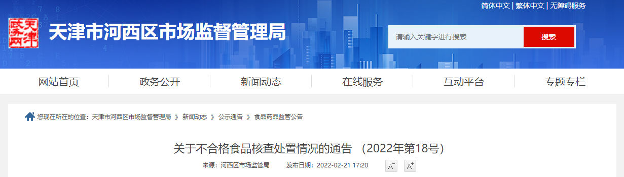 中國質(zhì)量新聞網(wǎng)訊 2月21日,天津市河西區(qū)市場監(jiān)管局網(wǎng)站發(fā)布關(guān)于不合格食品核查處置情況的通告 (2022年第18號)。