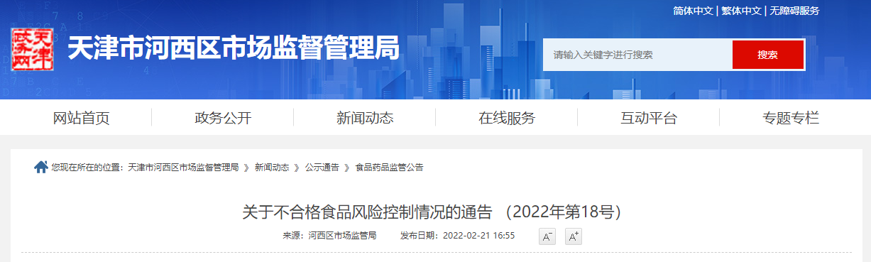中國質(zhì)量新聞網(wǎng)訊 2月21日,天津市河西區(qū)市場監(jiān)管局網(wǎng)站發(fā)布關(guān)于不合格食品風險控制情況的通告(2022年第18號)。
