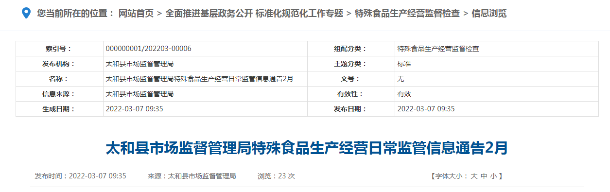 | 太和縣市場(chǎng)監(jiān)督管理局特殊食品生產(chǎn)經(jīng)營(yíng)日常監(jiān)管信息通告(2022年2月) | ||||||||