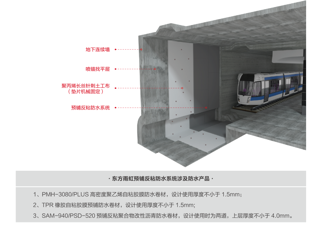 多年來,東方雨虹積極探索軌道交通地下工程領域,不斷優(yōu)化升級研發(fā)、生產(chǎn)、施工等各個環(huán)節(jié),推出軌道交通地下工程防水密封系統(tǒng)不斷迭代升級,針對不同結構形式提供更為專業(yè)具體的系統(tǒng)解決方案。目前,東方雨虹已形成明挖法底板預鋪反粘防水系統(tǒng)、側墻抗流掛系統(tǒng)、頂板防排蓄系統(tǒng)、暗挖盾構區(qū)間橡膠密封止水系統(tǒng)、高架段薄涂聚氨酯系統(tǒng)等多個系統(tǒng)相結合的全方位立體式設防網(wǎng)絡,保障地鐵軌道工程安全運營。