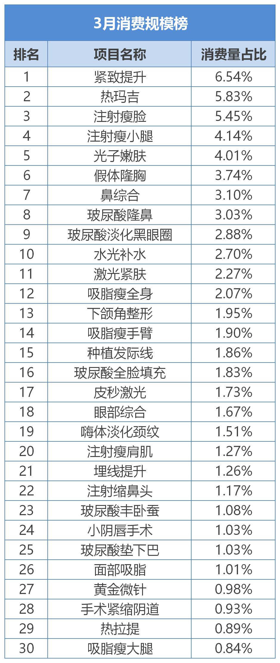 據(jù)醫(yī)美查顯示,除光子嫩膚外,消費(fèi)規(guī)模、訂單量TOP5均有注射瘦臉和注射瘦小腿。其中在3月消費(fèi)規(guī)模榜中,注射瘦臉、注射瘦小腿分別排名第三、第四;在3月消費(fèi)訂單榜中,注射瘦臉則以8.68%的占比位居第二,僅次于光子嫩膚,而注射瘦小腿則同樣排名第四。