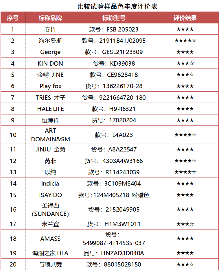 20款樣品中耐汗?jié)n色牢度、耐水色牢度的色澤變化結(jié)果均表現(xiàn)優(yōu)異,貼襯沾色結(jié)果總體表現(xiàn)較好,耐摩擦色牢度檢測結(jié)果總體表現(xiàn)較好。