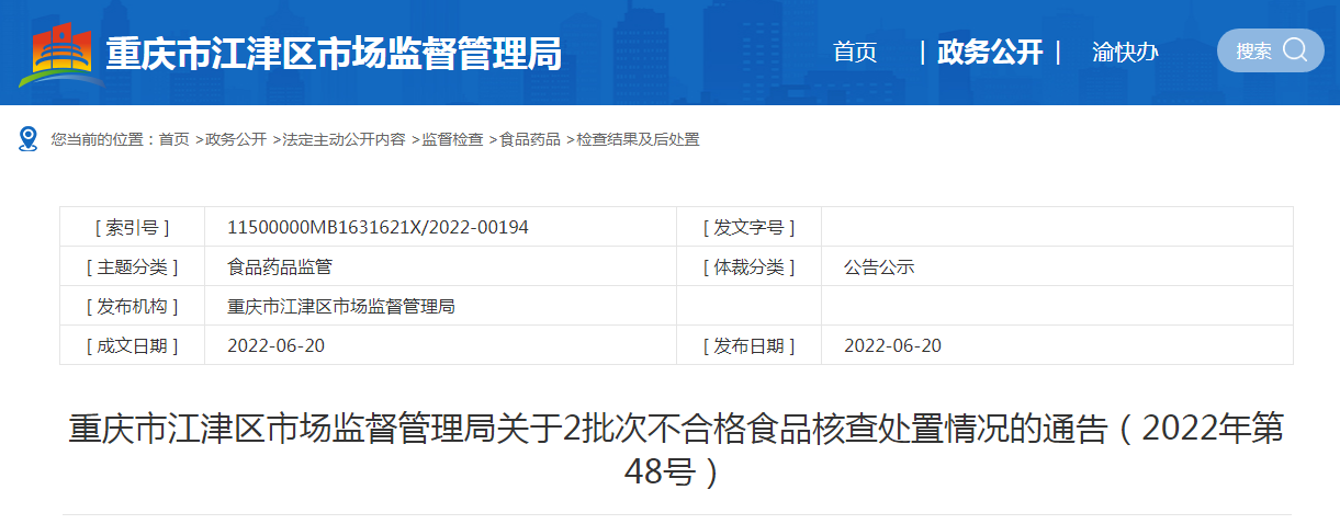 重慶市江津區(qū)市場監(jiān)督管理局關于2批次不合格食品核查處置情況的通告(2022年第48號)